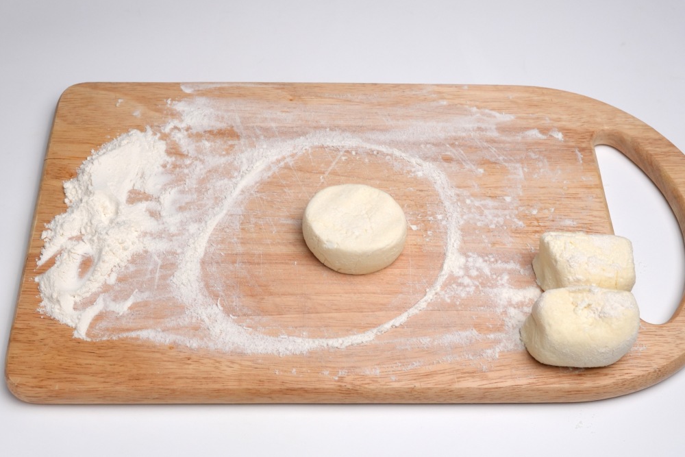 Добавить в творожную массу муку (5ст.л), перемешать и переложить на плоскую поверхность, присыпанную мукой. Обмять массу, чтобы тесто получилось однородным.