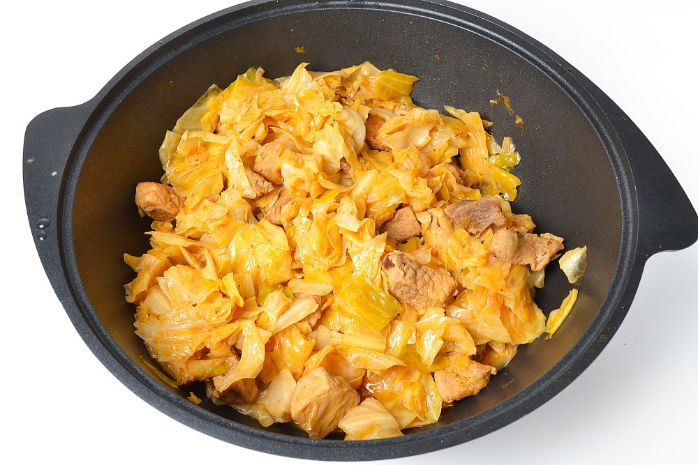 Слегка хрустящая, умеренно сладковатая тушеная капуста с нежным мясом готова. Она заметно уменьшилась в объеме.