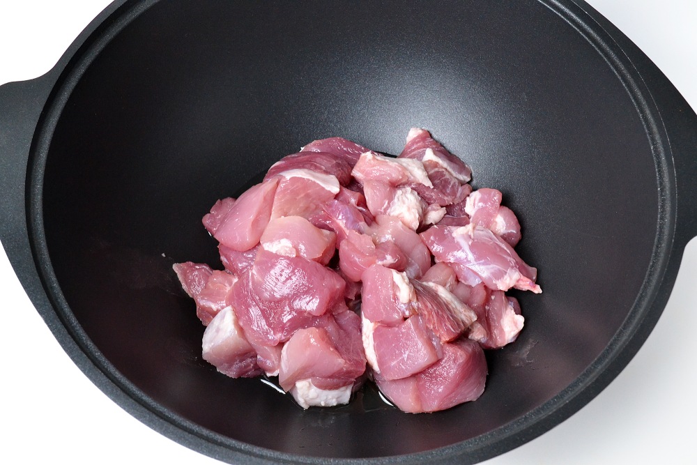 Мясо нарезать кубиками среднего размера или брусочками. Пока нарезаете мясо, поставьте кастрюлю или казан разогреваться, влив в него 2/3 масла.