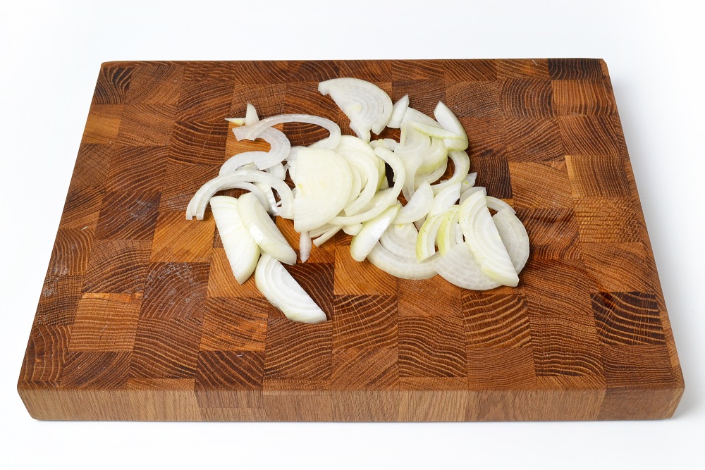 Пока жарится мясо, нарезать полукольцами лук.