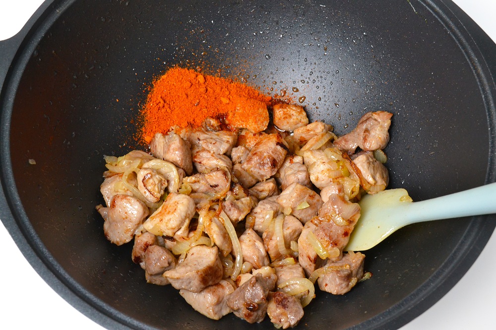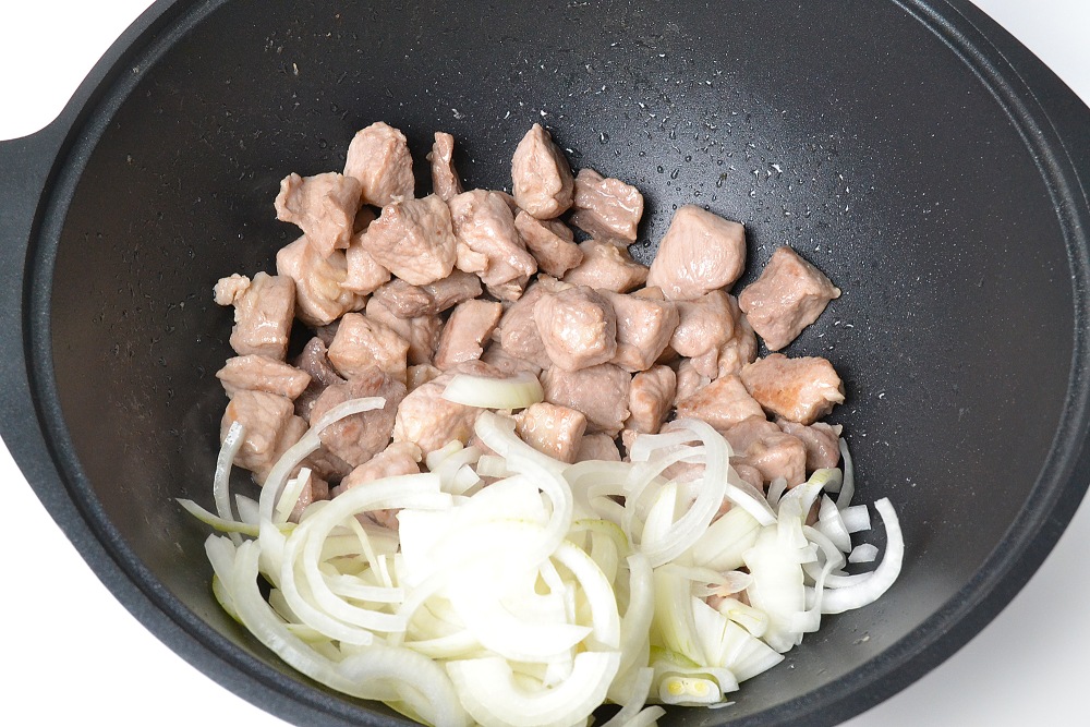 – Если хотите более насыщенный коричневый цвет, обжарьте сначала лук, а затем добавьте к нему мясо.