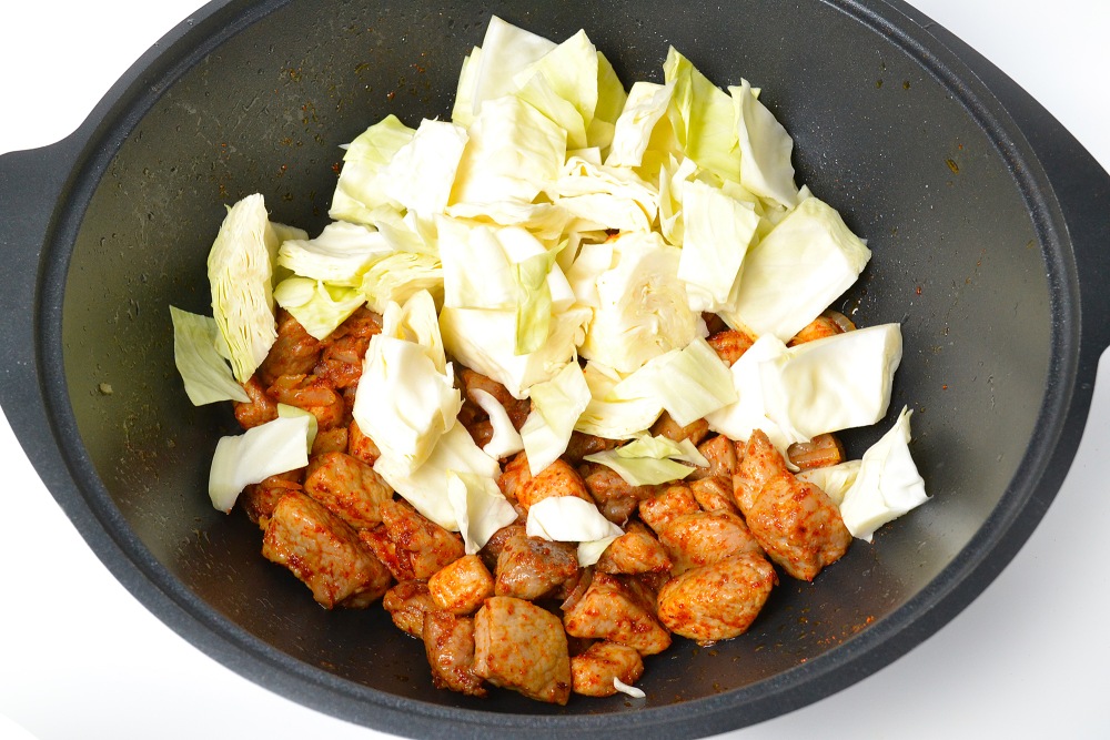 Выложить капусту полностью. Если капусты много, и она не входит в кастрюлю, добавляйте партиями каждые 2-3 минуты. При пропаривании под крышкой капуста быстро уменьшается в объеме. Да, она все равно приготовится равномерно.