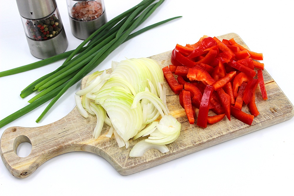 Соломкой нарезать болгарский перец, а лук нашинковать перьями.