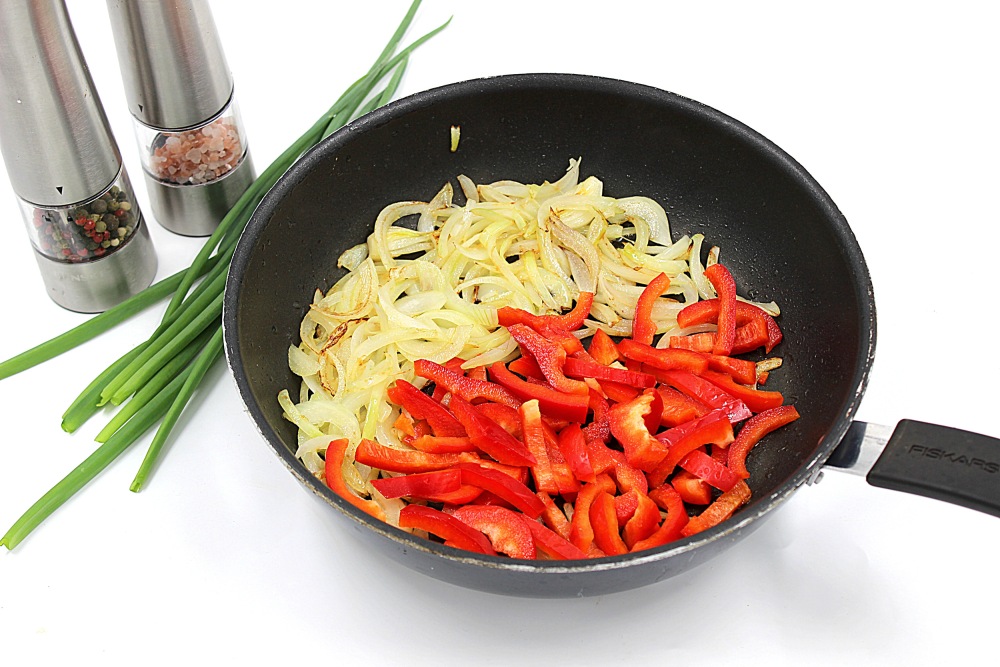 Нагреть сковороду с маслом, обжарить 2 мин лук и добавить перец. Обжаривать еще минуты 3.