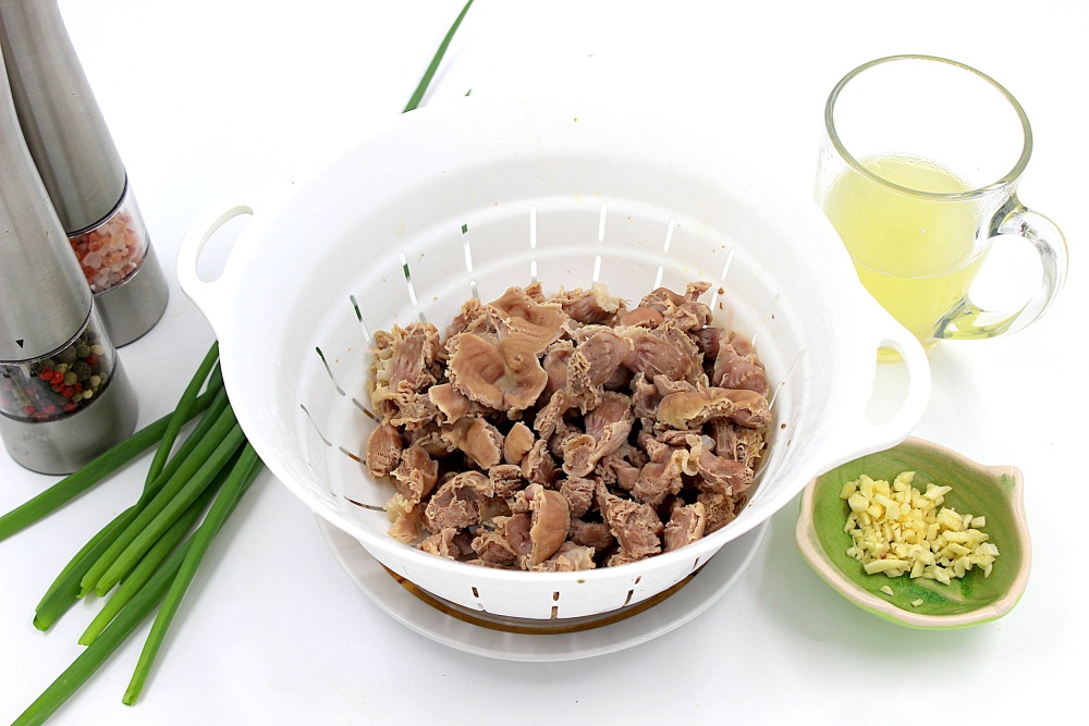 Слить бульон и откинуть куриные желудки на дуршлаг. Измельчить чеснок.