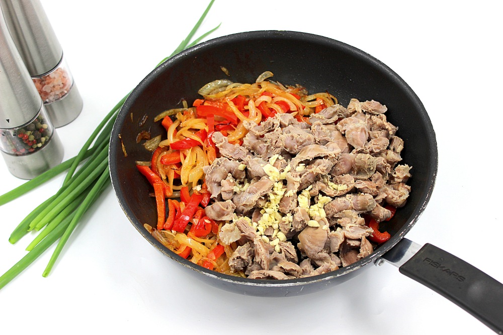 К овощам добавить желудки, измельченный чеснок и обжаривать всё еще пару минут.