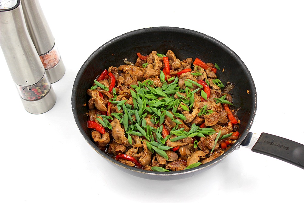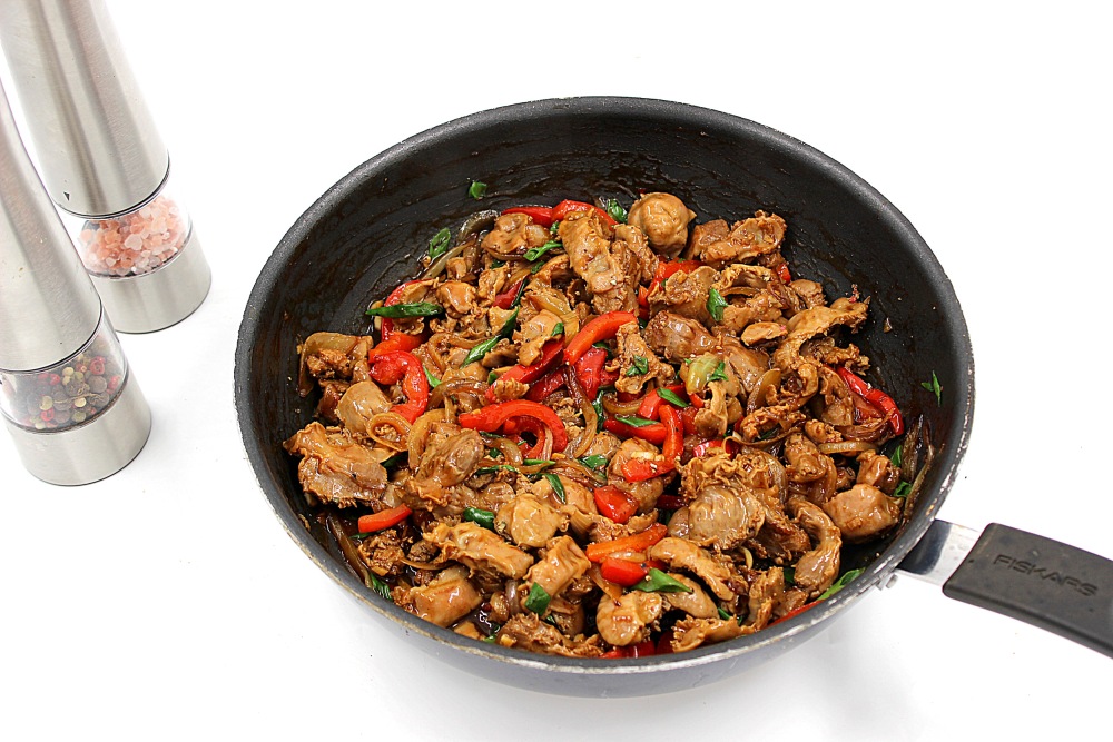 Люблю и готовить, и есть куриные субпродукты. Наверное, чаще всего их тушат с овощами или грибами. Сливочный, сметанный соус- всё им подходит. Это действительно очень вкусно. Но когда хочется чего то этакого, то готовлю их в азиатском стиле, с добавлением терияки и соевого соуса. Такое блюдо можно подавать как самостоятельное, с рисом или как горячую закуску. Если самостоятельное, то соуса можно делать и побольше.