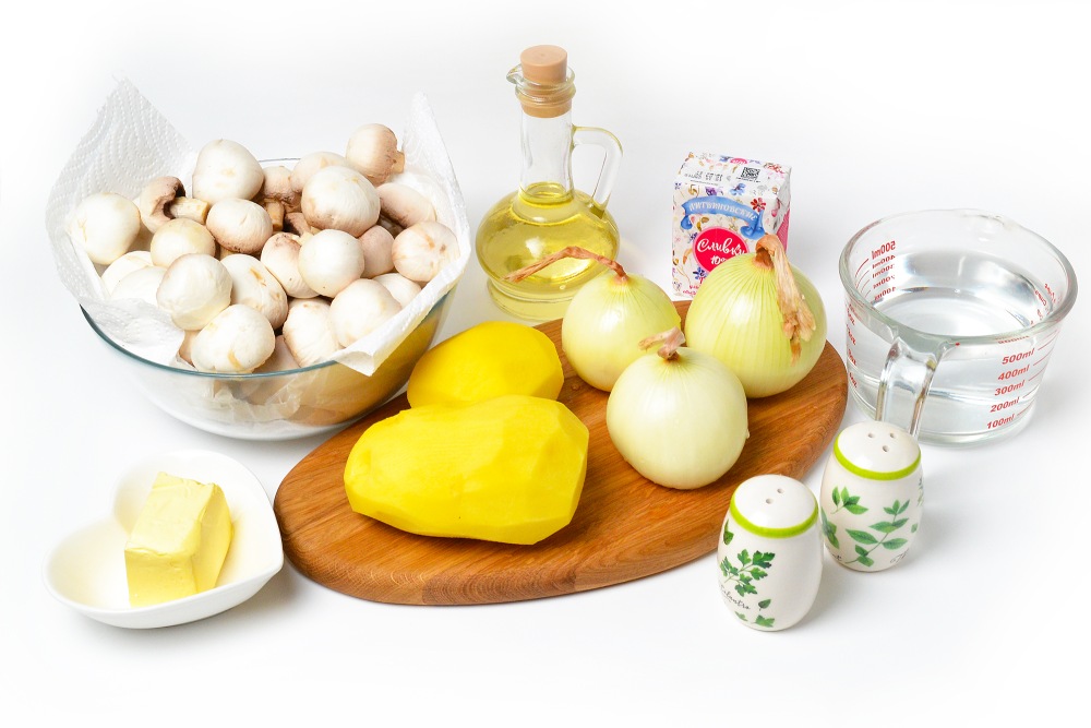 Подготовить ингредиенты: грибы, лук, картофель, сливочное и растительное масло, соль, перец, воду. При разогреве потребуются сливки.