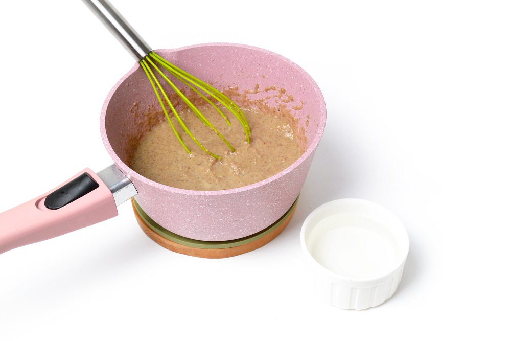 Влить 100 мл сливок или воды и еще раз тщательно перемешать венчиком, нагрев снизить (4/6 для электроплиты). Готовить до первых пузырьков кипения, но не кипятить.