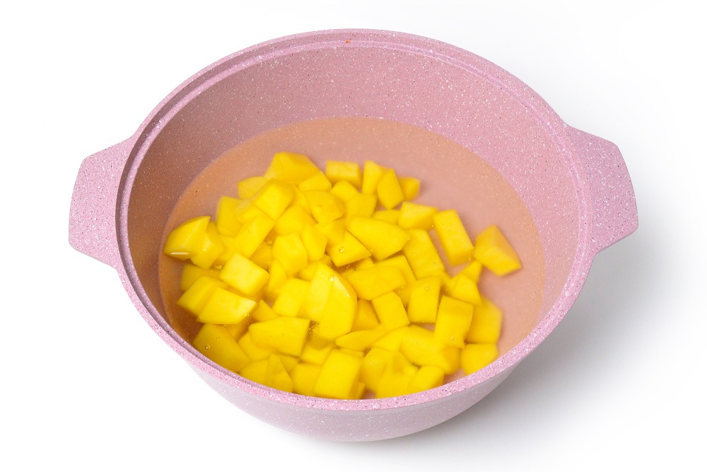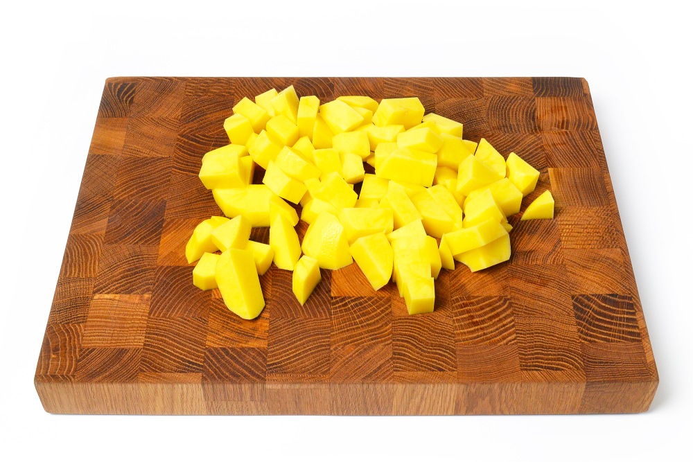Первым делом поставить на плиту кастрюлю с 1-1,5 л воды. А картофель нарезать крупными кубиками. Главный нюанс в приготовлении супа-пюре для заморозки – сделать его гуще, чем нужно, чтобы потом без проблем разбавить водой или сливками после размораживания.