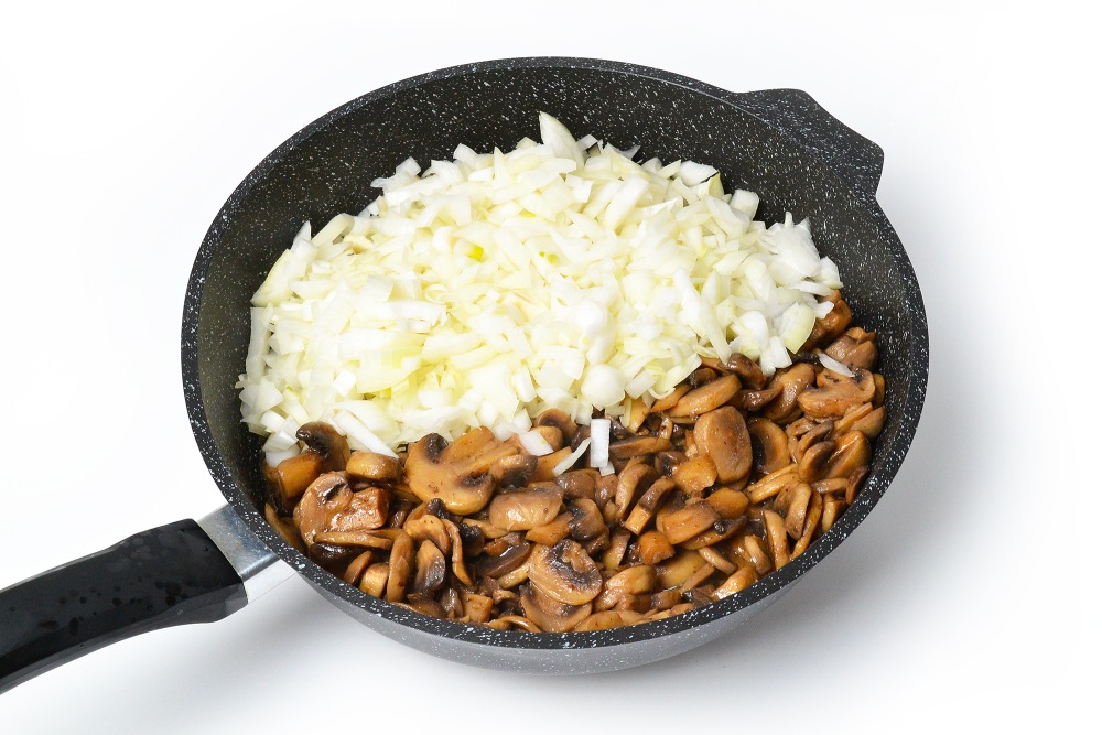 Добавить измельченный лук и жарить еще 6-7 минут до его мягкости и полного испарения влаги на сильном огне.