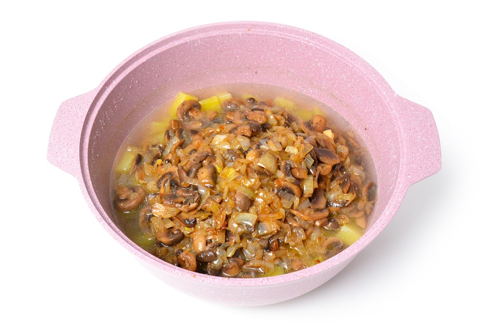 Перед тем, как заморозить грибной суп-пюре, нужно его правильно приготовить. Указанного количества ингредиентов хватит для приготовления чуть больше 2 л концентрированного супа (не считая сливок или воды для разбавления).