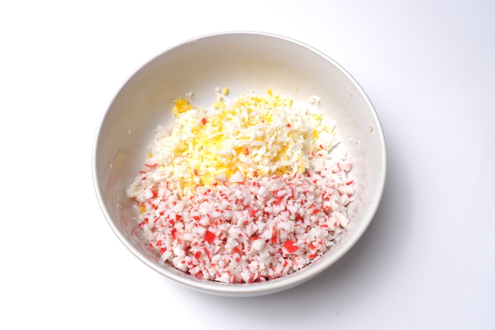 – Для ускорения процесса крабовые палочки, яйца и сыр можно измельчить в блендере.