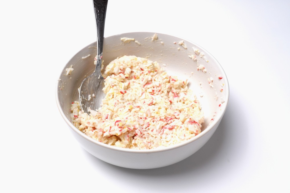 Смешать в чаше измельченные крабовые палочки, яйца и рис. Поперчить и, при необходимости, посолить начинку.