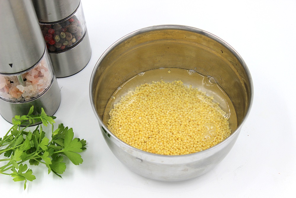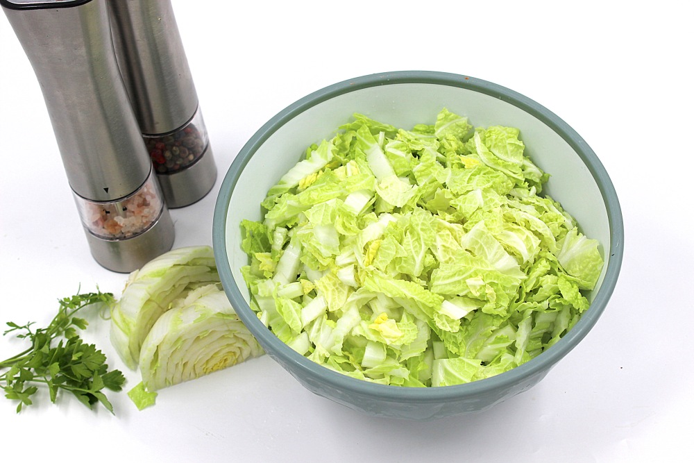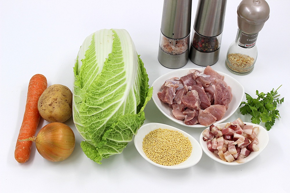 Подготовить все ингредиенты для капустняка с пекинской капустой и пшеном.