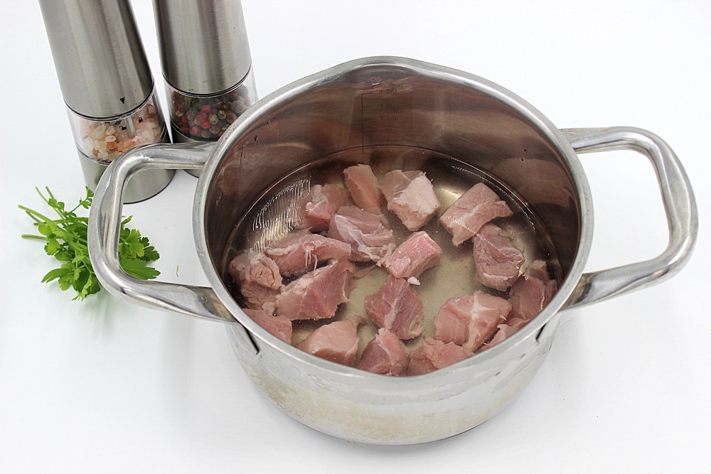 Налить в кастрюлю пол литра воды и поставить вариться свинину, примерно на пол часа. Снять образующуюся пену.
