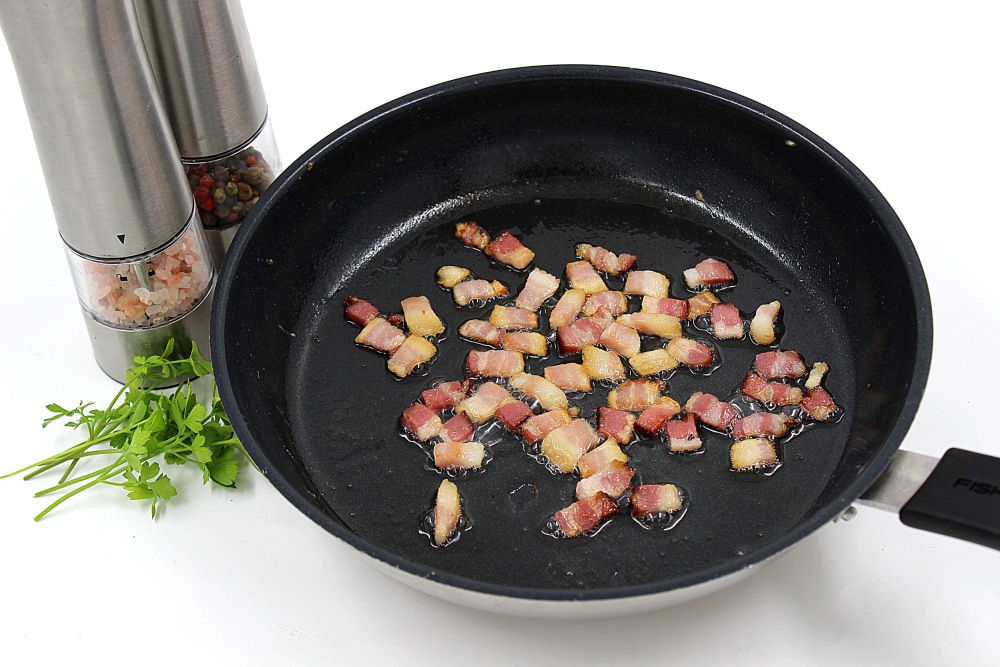 Несколько минут обжарить кубики бекона, на среднем огне.