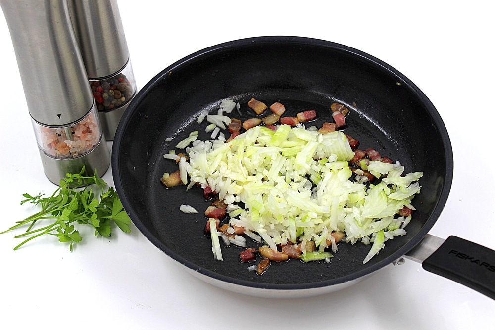 Нашинковать и добавить к бекону мелко нарезанный лук. Обжаривать еще 2 мин.