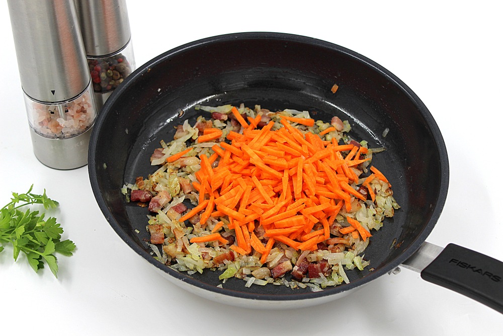 Нарезать или натереть морковь и добавить в сковороду, обжаривая всё вместе еще пару минут.