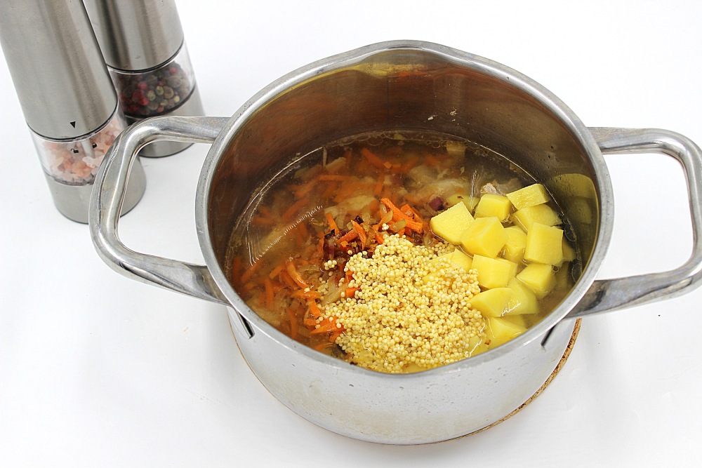 В кастрюлю к мясу добавить пол литра воды, пшено, картофель, овощную обжарку, соль и варить 5-7 минут.