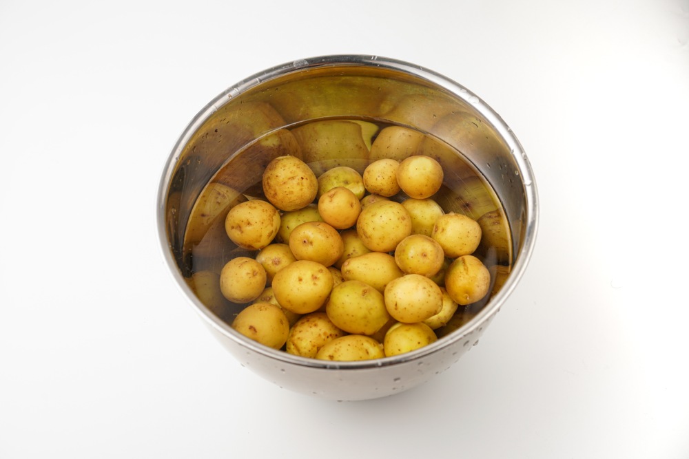 Промыть картофель тёплой водой, аккуратно потереть щёткой каждую картофелину, чтобы удалить грязь. При использовании молодых клубней кожуру не снимать, она даст дополнительный вкус и текстуру.