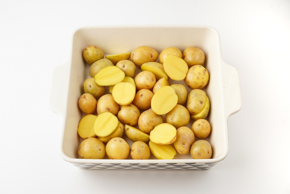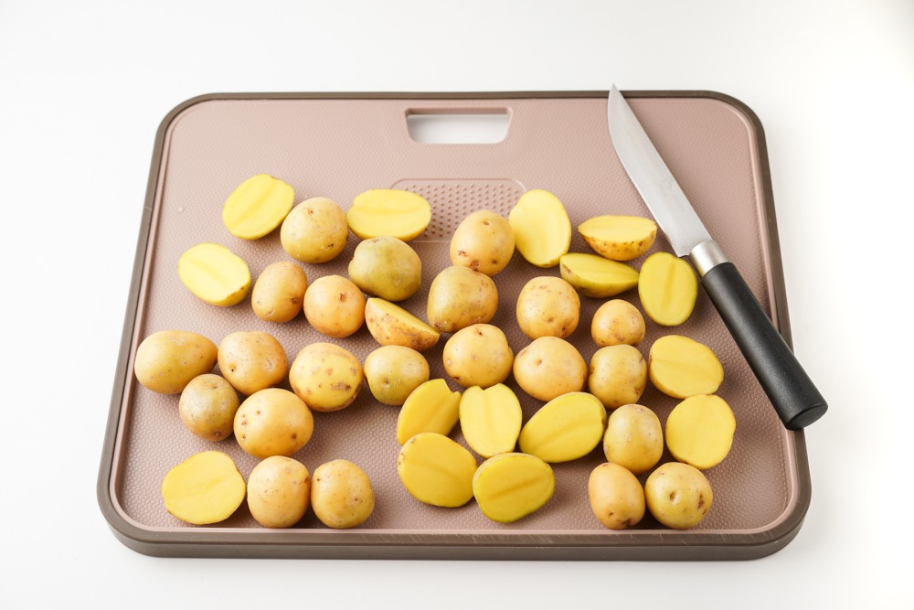 Крупные клубни разрезать пополам или на четвертинки, чтобы кусочки получились примерно одинакового размера.