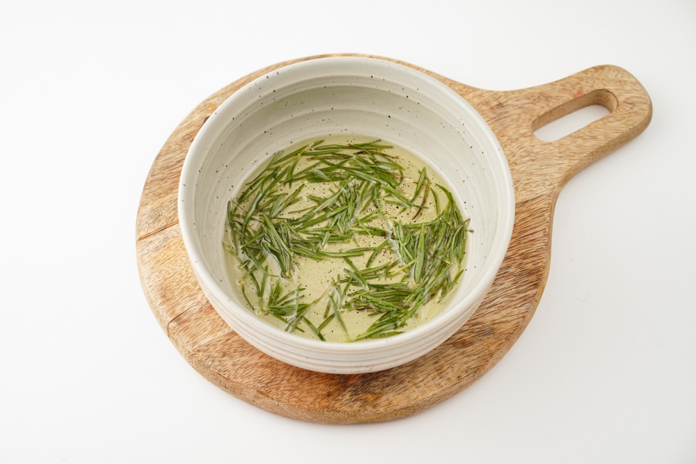Приготовить маринад. Смешать оливковое масло, соль, перец. Отделить листики розмарина от стеблей, крупно порвать листики руками (это даст более насыщенный аромат, чем мелкая рубка). Тщательно перемешать.