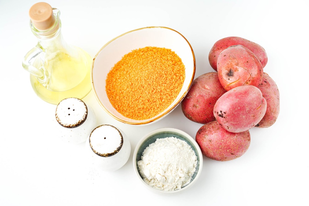 Подготовить ингредиенты для постных картофельных котлет из пюре на сковороде. Картофель среднего размера без тёмных пятен и повреждений. Отмерить муку и подготовить панировочные сухари в отдельной тарелке. Поставить рядом сковороду и масло, чтобы всё было под рукой во время жарки.