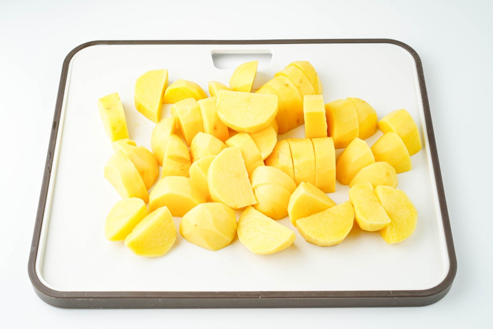 Промыть клубни под проточной водой. Очистить от кожуры тонким слоем, стараясь не срезать лишнего. Нарезать крупными дольками одинакового размера, чтобы картофель сварился равномерно.
