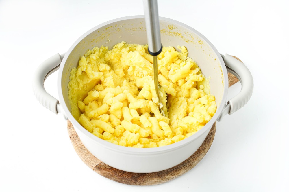 Вернуть кастрюлю на плиту на минимальный огонь на 1–2 минуты, чтобы выпарить остатки влаги. Размять картофель толкушкой до однородного состояния без крупных комочков. Дать пюре немного остыть, чтобы с ним было удобно работать руками.