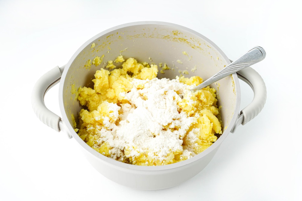 Всыпать муку в остывшее пюре. Тщательно перемешать ложкой или руками до однородности. Оценить консистенцию - масса должна быть пластичной и не липнуть слишком сильно к рукам.