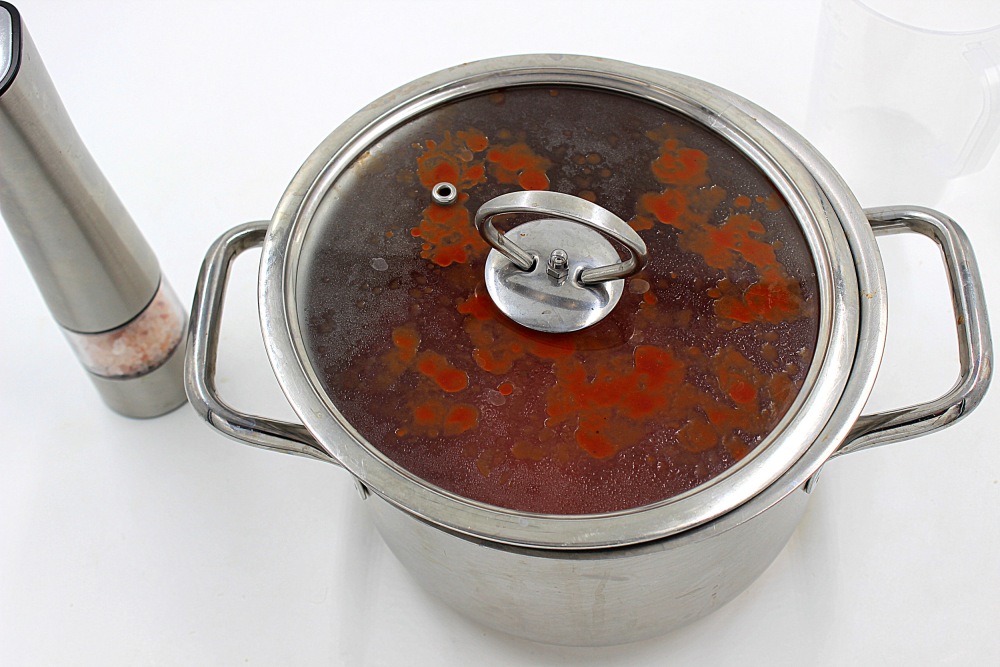 Даже при самом лёгком кипении кетчуп ну очень стреляет и брызгается. Это видно по моей крышке.