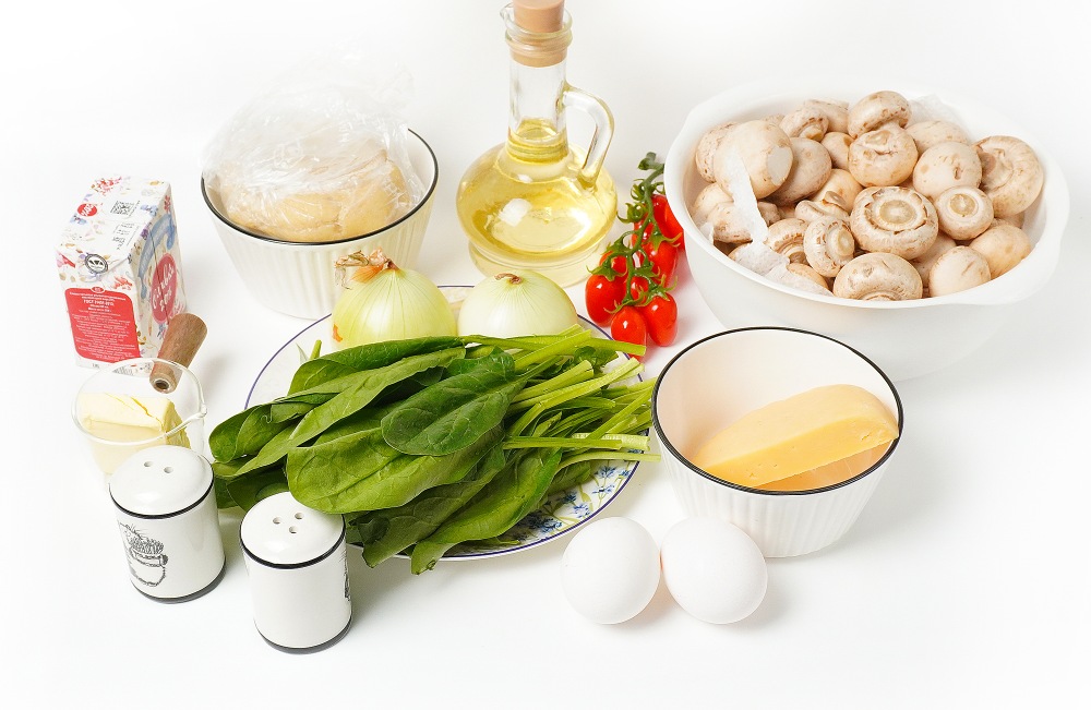 Подготовить ингредиенты: для замораживания начинки взять грибы, шпинат, лук, сливочное и растительное масло. Затем потребуется замороженное песочное тесто, сливки, сыр, яйца, а также соль и перец.