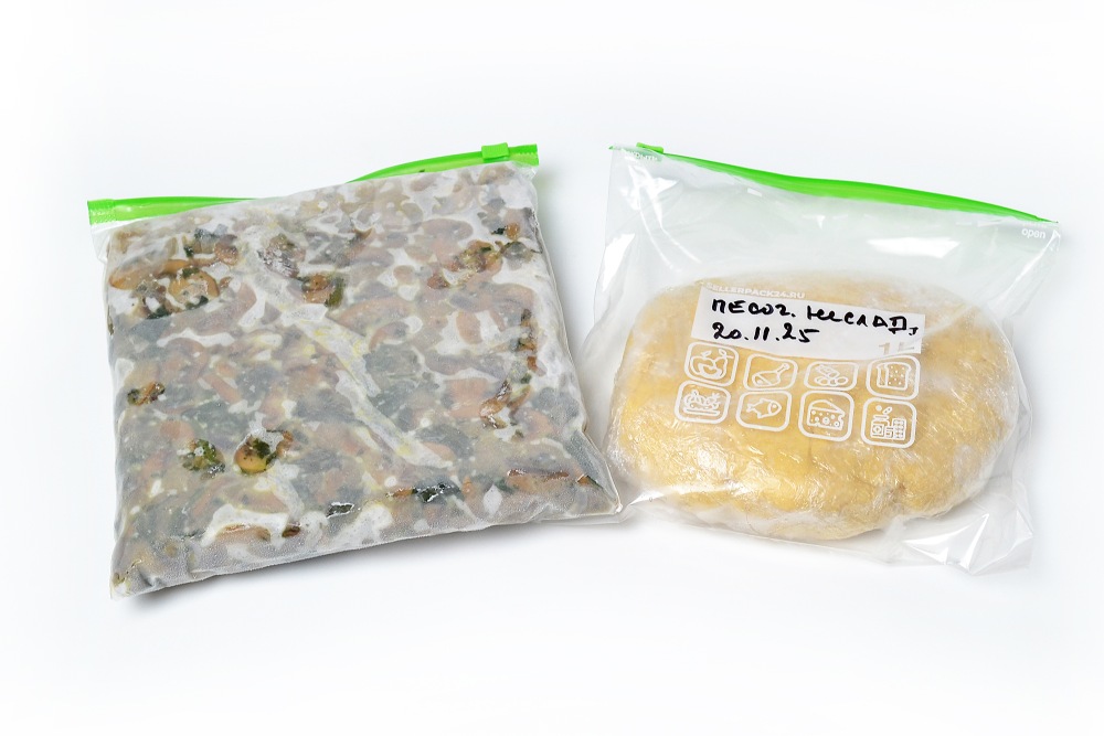 Переложить в зип-пакет, выдавить лишний воздух и хорошо разровнять. Также можно упаковать вакууматором, так аромат и вкус сохранится еще лучше и дольше. Можно подписать дату и название начинки, чтобы потом не забыть, что это. Убрать в морозилку для замораживания.