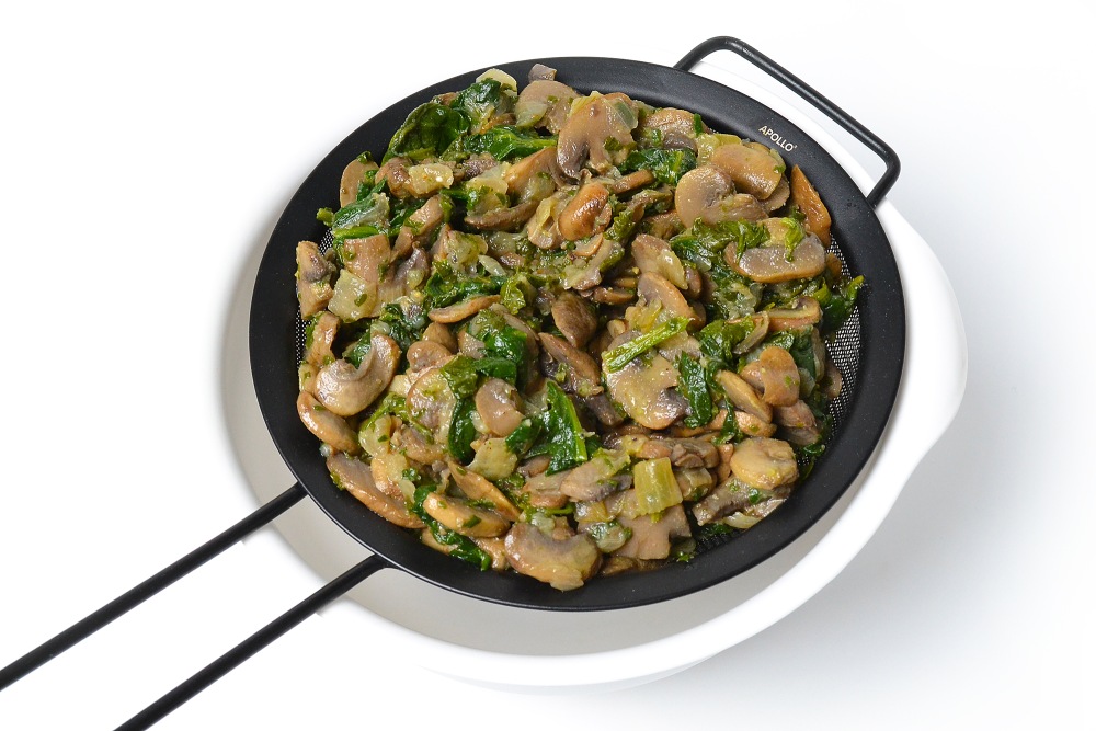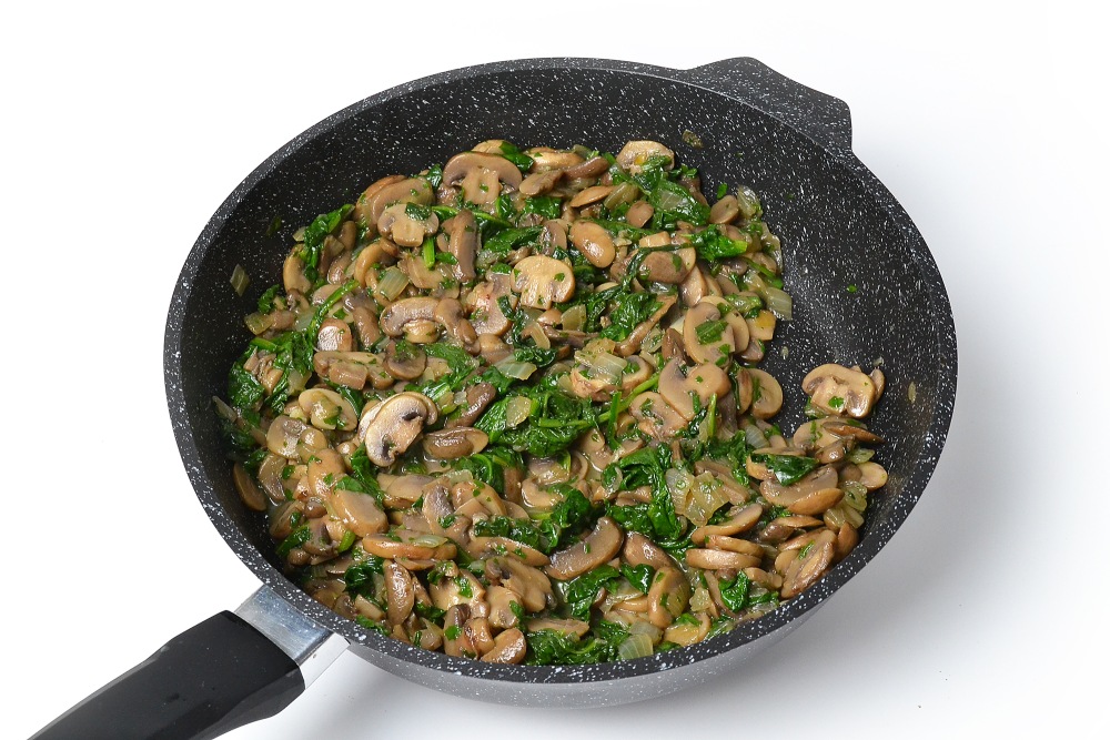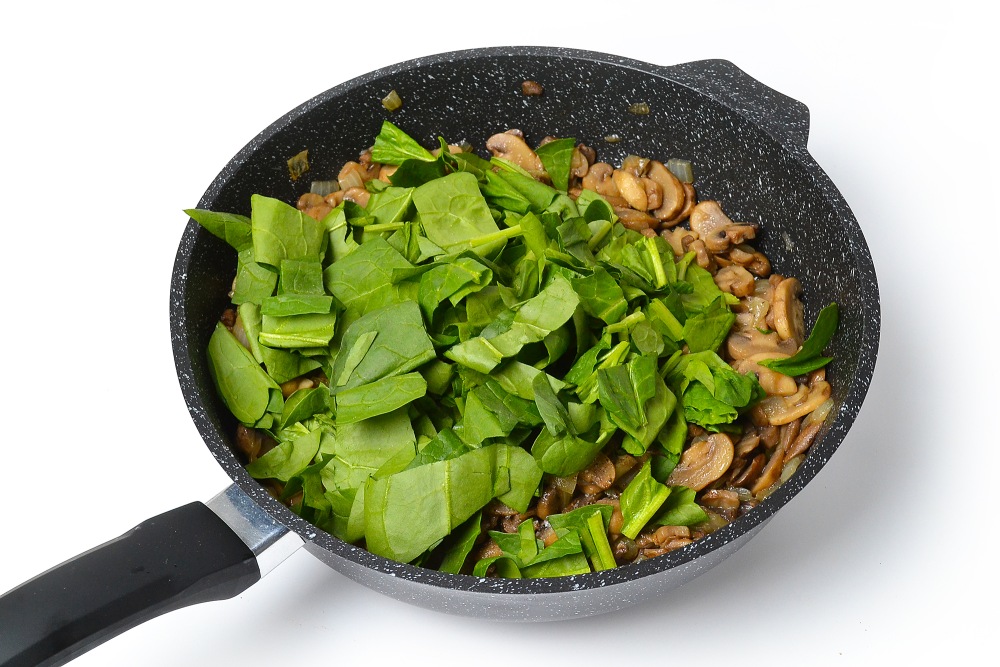 Крупно нарезать шпинат и выложить к грибам.