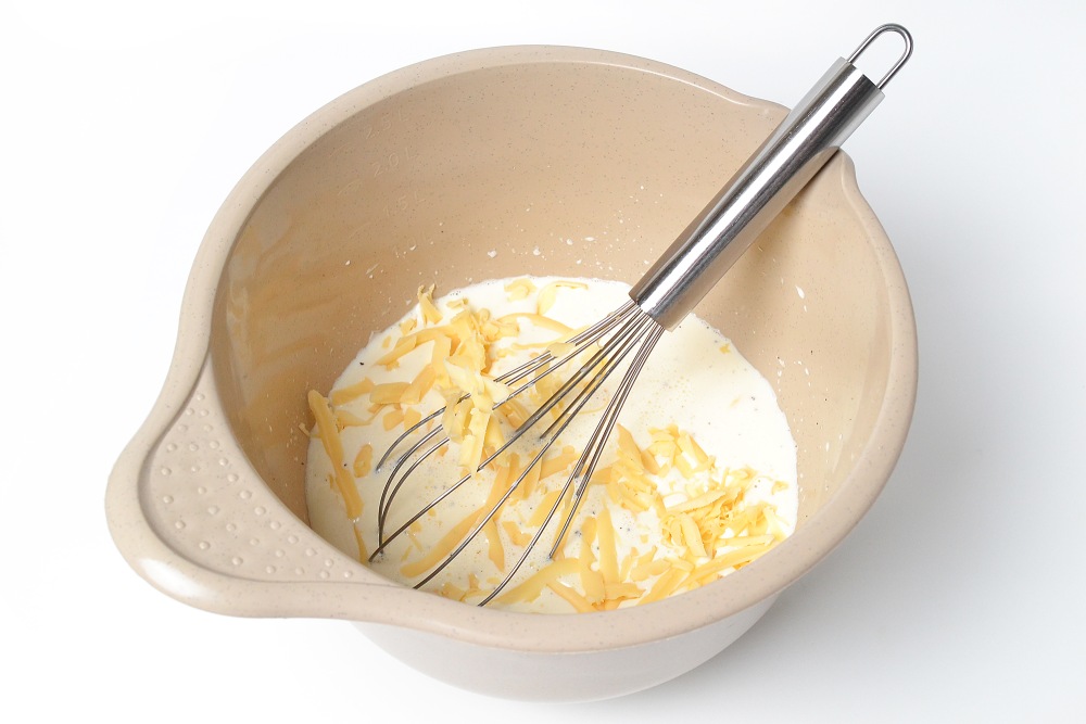 Смешать в миске яйцо и сливки, добавить соль и перец, всыпать немного сыра.