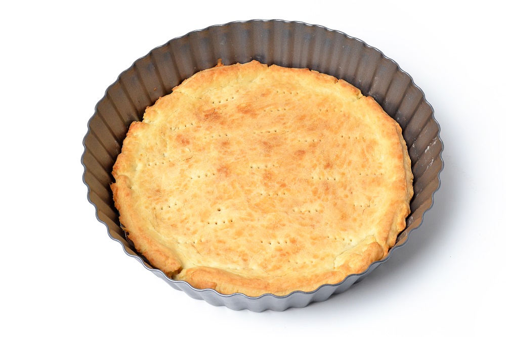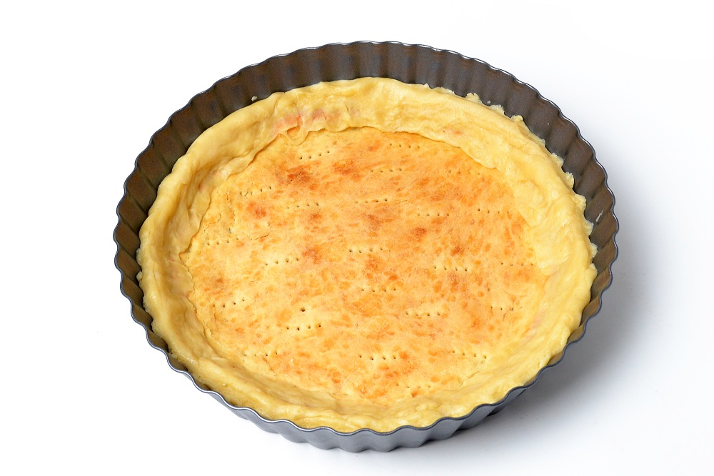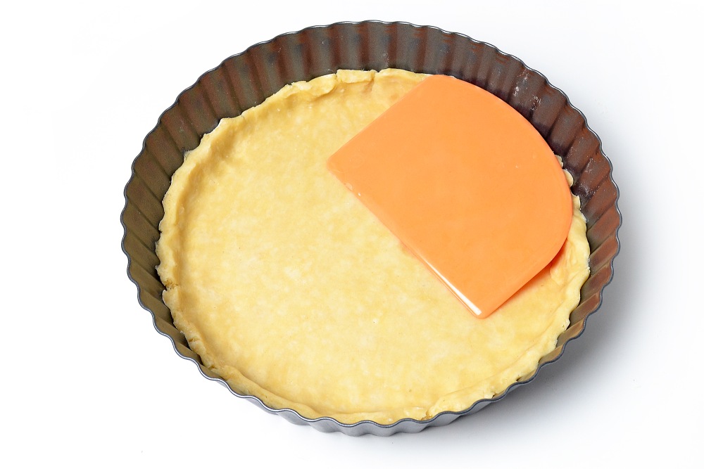 Отрезать ¼ теста для будущих бортиков. Раскатать оставшееся тесто чуть больше диаметра дна формы, чтобы сформировать внутри нее бока. Я использую форму с верхним диаметром в 24 см.