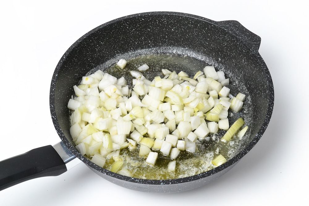 Лук мелко нарезать, пока разогревается масло. Отправить его на сковороду и жарить на сильном огне 4-5 минут до полупрозрачности и золотистости.