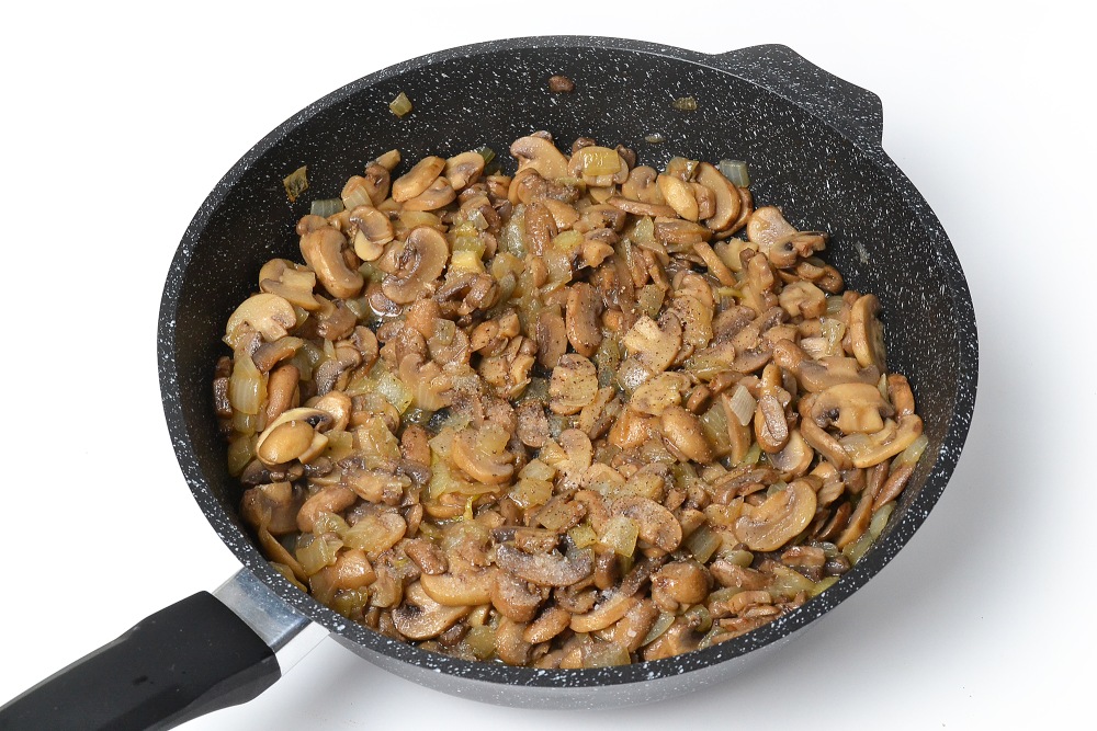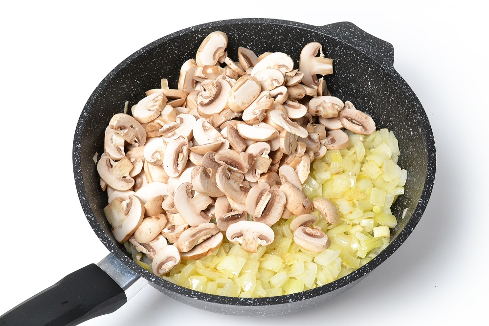 Пока жарится лук, нарезать грибы слайсами. Мельчить не обязательно. Целые слайсы красиво смотрятся на срезе киша и придают ему приятную текстуру. Отправить грибы к луку.