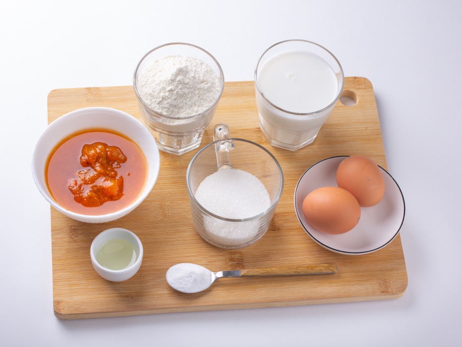 Подготовить все ингредиенты для простого классического пирога с вареньем. Достать заранее из холодильника кефир и яйца, хотя бы за 30 минут. Это позволит тесту лучше подняться при выпечке. Отмерить нужное количество муки, сахара, варенья. Варенье можно использовать любое, которое у вас есть. Я использую абрикосовое. Заранее разогрейте духовку до 180 °C.