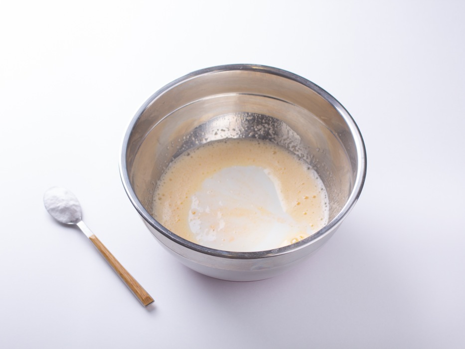 Добавить соду и все перемешать. В тесте могут появиться пузырьки - это сода вступила в реакцию с кефиром.