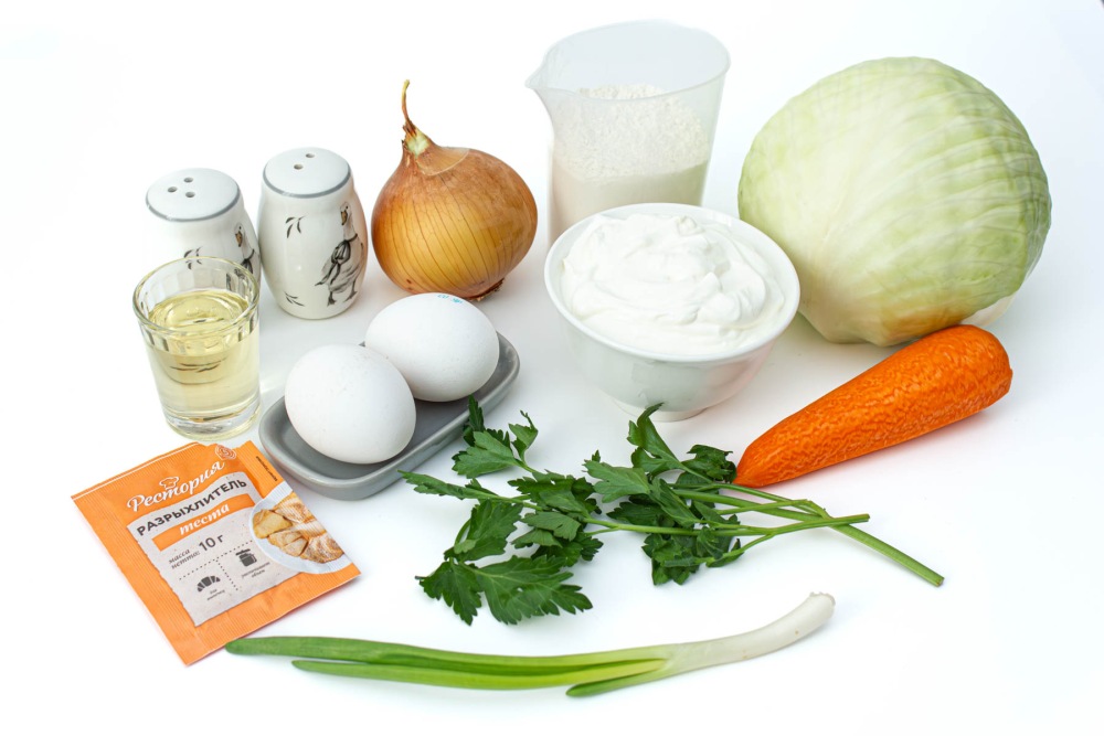 Подготовить необходимые ингредиенты для классического заливного пирога с капустой на сметане.