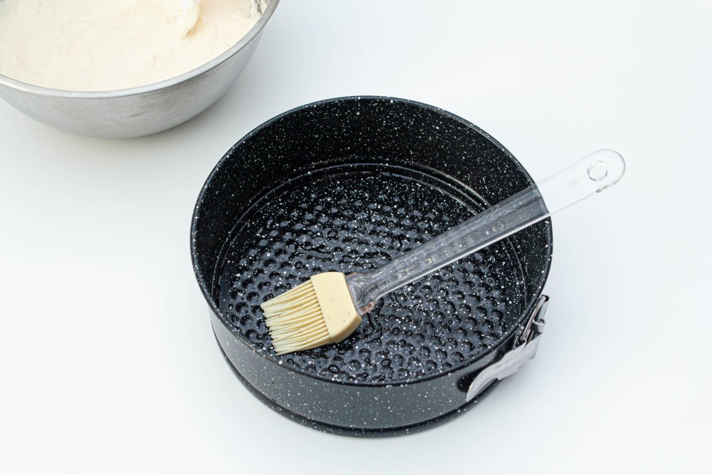 Форму для запекания (у меня диаметр 20) смазать при помощи силиконовой кисточки растительным маслом.