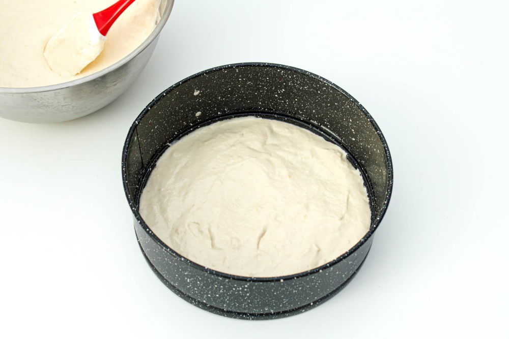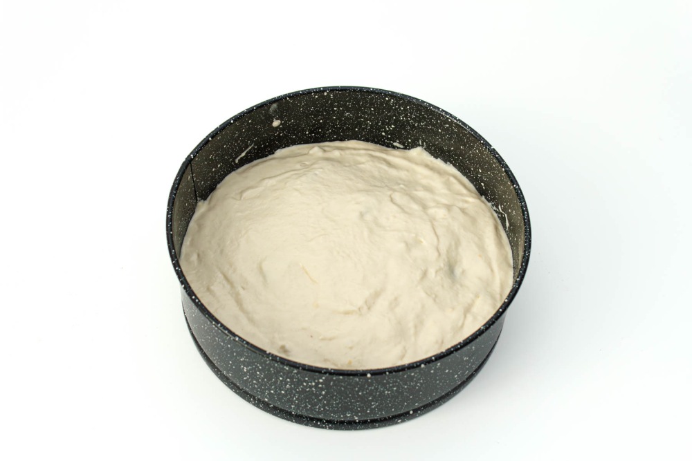 Влить в форму для запекания половину теста. Равномерно распределить лопаткой.
