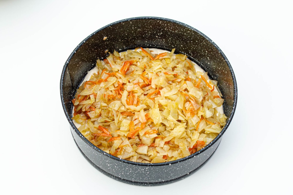 На тесто выложить начинку из капусты и моркови. Равномерно распределить лопаткой.