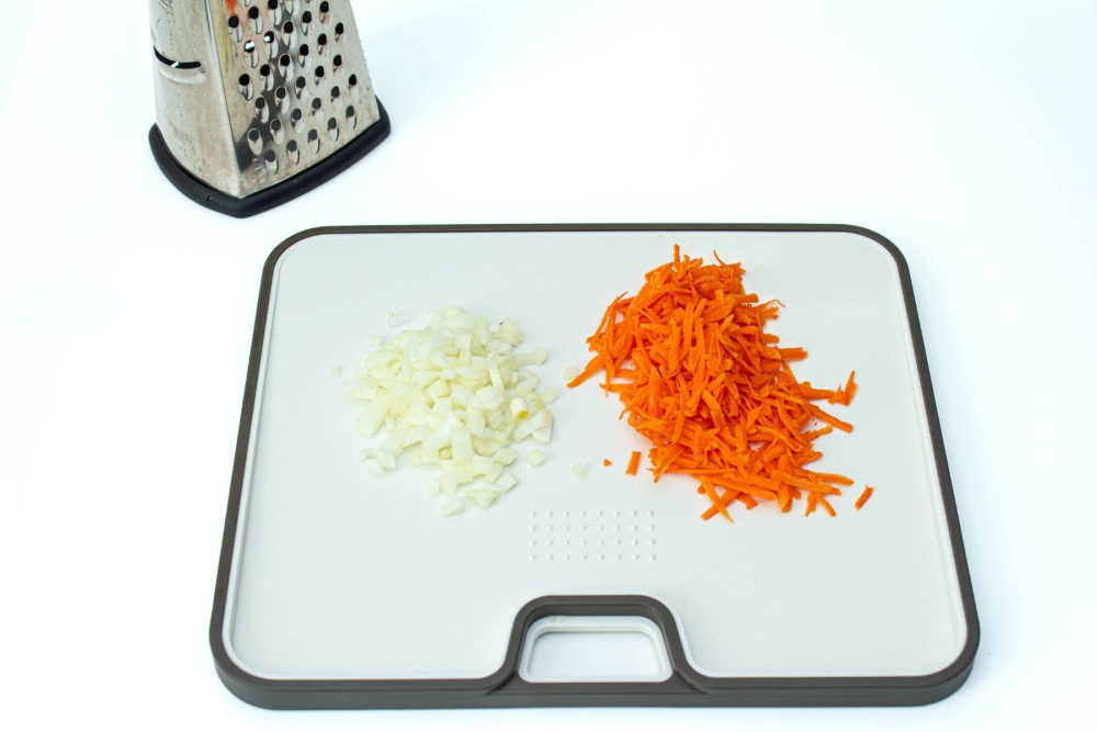 Лук очистить от шелухи и нарезать кубиком. Морковь очистить от кожуры и натереть на крупной терке.