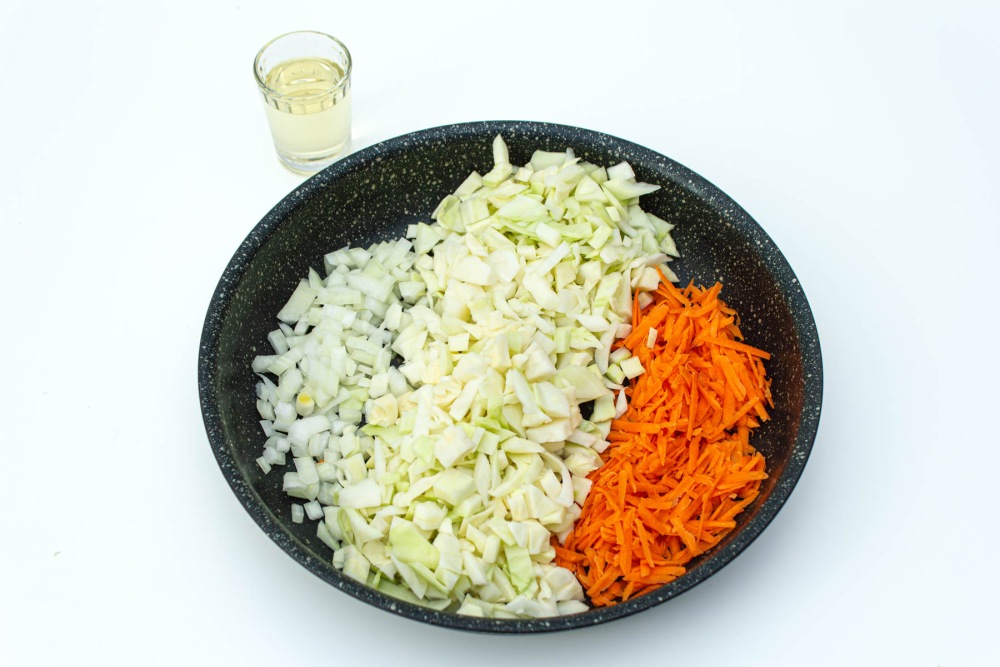 Разогреть сковороду с растительным маслом и переложить нарезанный лук, морковь и капусту.