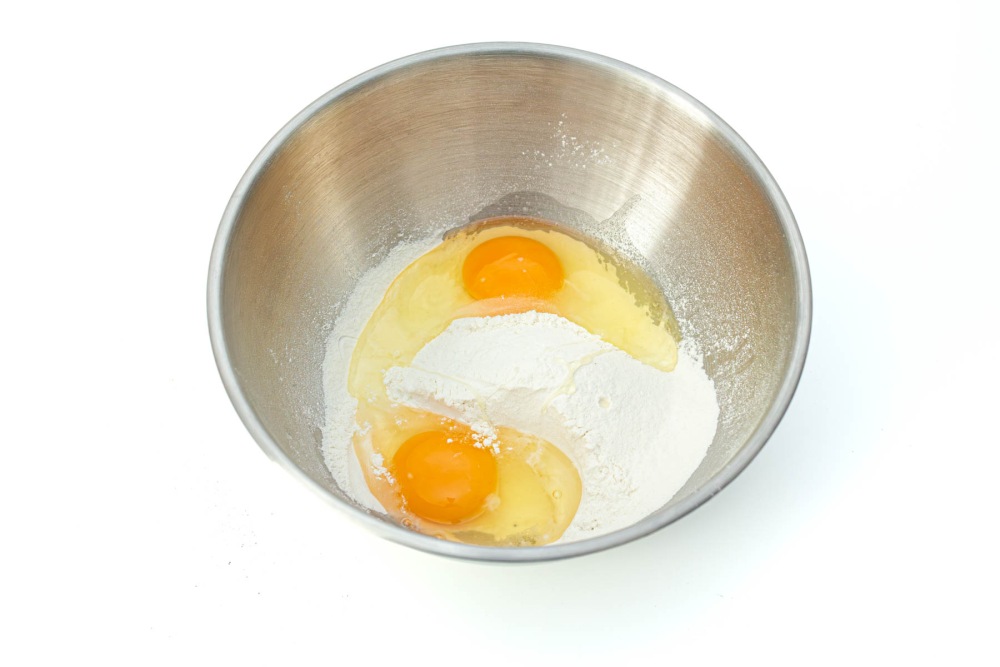 Яйца промыть и обсушить полотенцем. Разбить в чашу с мукой два яйца категории С0 или отборное.