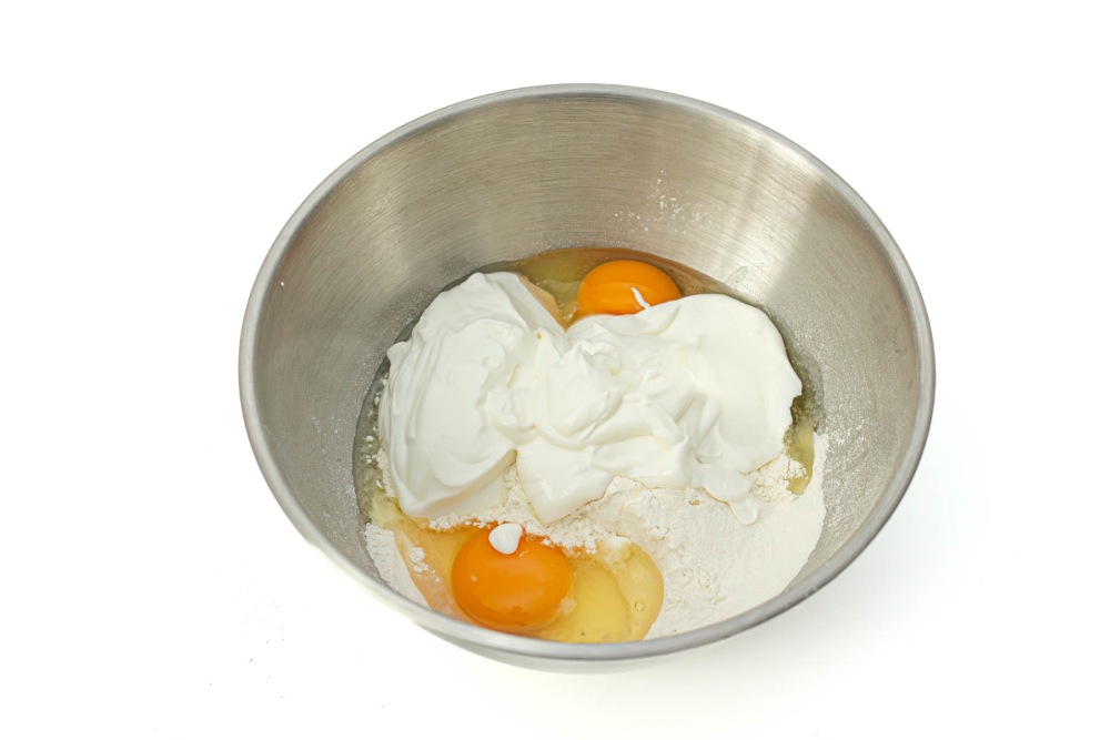 Добавить к муке и яйцам сметану.