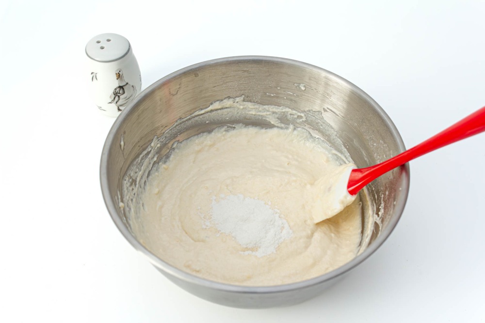 Все хорошо размешать при помощи лопатки или венчика. Добавить разрыхлитель для теста и соль по вкусу (щепотку).